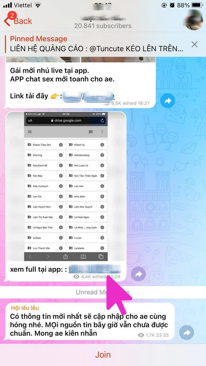 Bên cạnh đó, bên dưới cũng xuất hiện hàng loạt bình luận spam link dẫn về một group sex, group 18+ trên Telegram với số thành viên lên đến 20.000 người. Group Telegram này hoạt động như một ổ mại dâm trá hình, đồng thời câu dẫn người dùng tải về một ứng dụng livestream 18+ đã được chúng tôi lên án rất nhiều lần.
